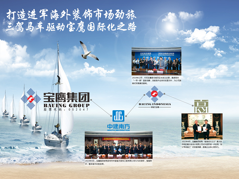 自2013年上市以來,寶鷹集團(tuán)就開始重點(diǎn)布局拓展海外市場,并響應(yīng)國家 “一帶一路”戰(zhàn)略號(hào)召,在印尼成立印尼寶鷹建設(shè)集團(tuán),聯(lián)姻深圳市中建南方建設(shè)集團(tuán)、深圳高文安設(shè)計(jì)有限公司,深度開拓海外市場。不到兩年,寶鷹集團(tuán)就在全球15個(gè)國家和地區(qū)獲得發(fā)展,今年7月,寶鷹集團(tuán)相繼在印尼、越南相繼簽署一系列建筑裝飾設(shè)計(jì)與施工大單。今年年初,寶鷹集團(tuán)還被評(píng)為“2015年中國走進(jìn)東盟十大成功企業(yè)”。深圳寶鷹集團(tuán)在全球建筑與裝飾工程服務(wù)發(fā)面的發(fā)展實(shí)力以及在國際市場的良好聲譽(yù)、過硬的產(chǎn)品質(zhì)量是本次入圍聯(lián)合國全球采購供應(yīng)商的重要原因。