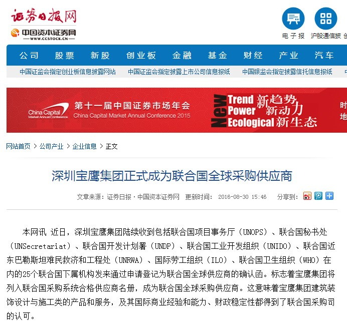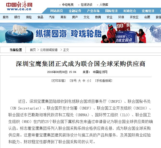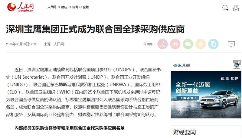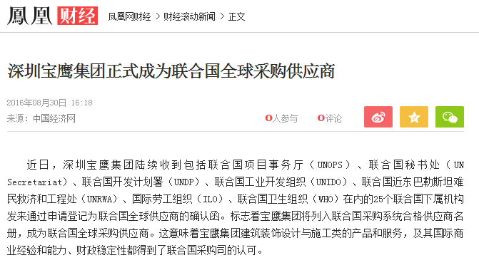 近日,深圳寶鷹集團(tuán)陸續(xù)收到包括聯(lián)合國項(xiàng)目事務(wù)廳(UNOPS)、聯(lián)合國秘書處(UN Secretariat)、聯(lián)合國開發(fā)計(jì)劃署(UNDP)、聯(lián)合國工業(yè)開發(fā)組織(UNIDO)、聯(lián)合國近東巴勒斯坦難民救濟(jì)和工程處(UNRWA)、國際勞工組織(ILO)、聯(lián)合國衛(wèi)生組織(WHO)在內(nèi)的25個(gè)聯(lián)合國下屬機(jī)構(gòu)發(fā)來通過申請登記為聯(lián)合國全球供應(yīng)商的確認(rèn)函。標(biāo)志著寶鷹集團(tuán)將列入聯(lián)合國采購系統(tǒng)合格供應(yīng)商名冊,成為聯(lián)合國全球采購供應(yīng)商。這意味著寶鷹集團(tuán)建筑裝飾設(shè)計(jì)與施工類的產(chǎn)品和服務(wù),及其國際商業(yè)經(jīng)驗(yàn)和能力、財(cái)政穩(wěn)定性都得到了聯(lián)合國采購司的認(rèn)可。