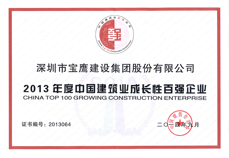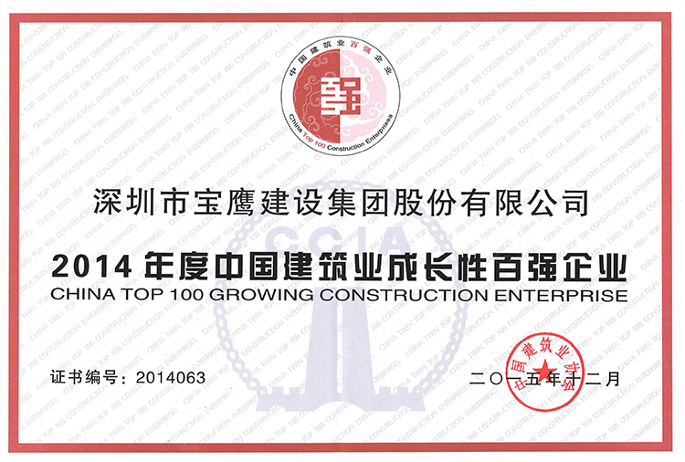 2010年——2014年,由中國建筑業(yè)協(xié)會(huì)發(fā)布的《中國建筑業(yè)雙百強(qiáng)企業(yè)》名單中,寶鷹集團(tuán)均獲得最具成長性百強(qiáng)榮譽(yù)。今年首次進(jìn)入競爭力榜單。在中國建筑業(yè)協(xié)會(huì)最后發(fā)布的《2015年度中國建筑業(yè)競爭力200強(qiáng)》名單上,80%以上的名額被大型央企、國企獲得,寶鷹集團(tuán)作為榜單中為數(shù)不多的建筑裝飾類民營企業(yè),此次入圍證明上市以來集團(tuán)取得的成績得到專家和社會(huì)肯定,也顯示了集團(tuán)在行業(yè)的排頭軍地位和綜合實(shí)力。