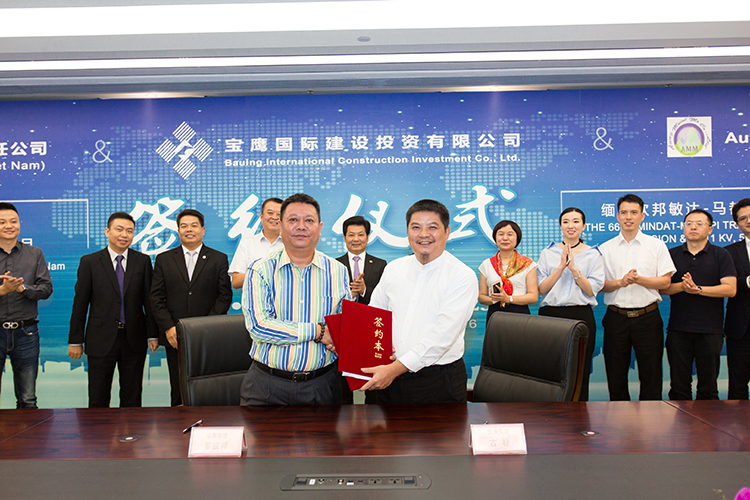 寶鷹集團(tuán)副總裁、寶鷹國(guó)際建設(shè)投資有限公司董事長(zhǎng)古樸與緬甸AMM公司U ZAW ZAW OO董事長(zhǎng)簽訂合同